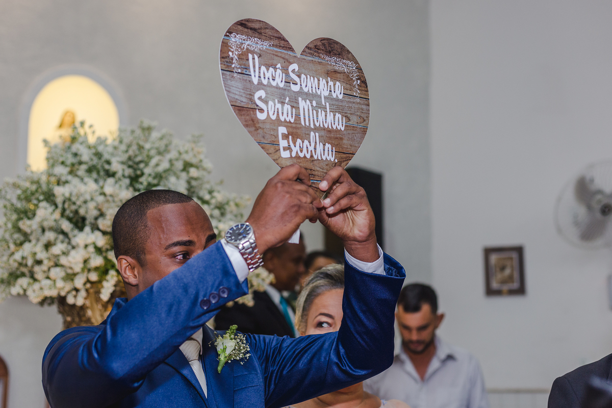 Ao entrar, a noivinha foi surpreendida com o noivo levantando uma plaquinha de Você Sempre Será Minha Escolha!