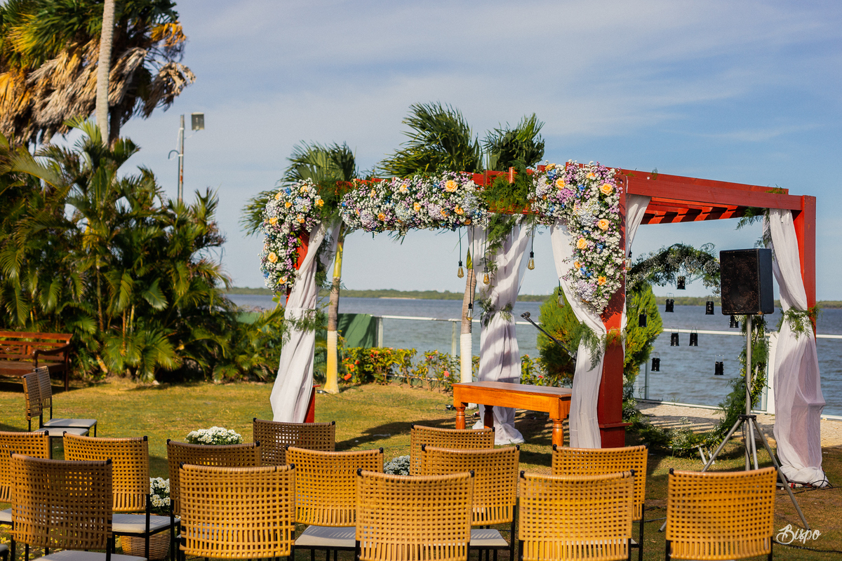 A noivinha estava deslumbrante, à medida em que ela ia entrando, as lágrimas dos convidados iam caindo, e o noivinho mal tirou o olho da sua amada. Nesse momento até caiu um cisco no meu olho... por ser um espaço aberto, acho que o vento trouxe.... rsrs, brincadeirinha! A Rafa entrou toda emocionada com as alianças... Imagina a felicidade dela em organizar e ver essa promessa se cumprindo na vida dos pais! Deus é maravilhoso!