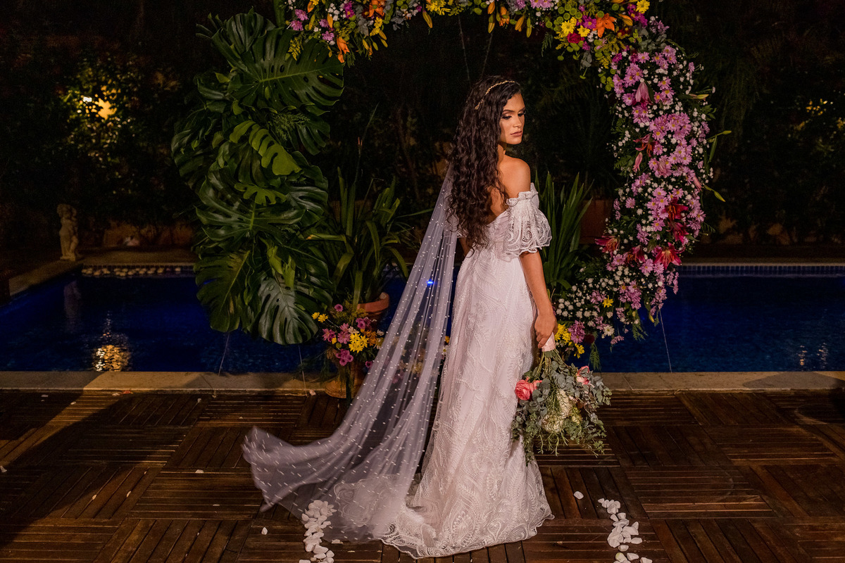 Ahhh, já íamos esquecendo de falar sobre o vestido da noiva. Um vestido com bastante significado: foi FEITO À MÃO PELA AVÓ DELA! Que talento, viu?! Ficou incrível! Além disso, o arco e toda decoração do casamento ficou na responsabilidade da tia da noiva, que também fez um trabalho lindo. 😍 Parabéns à essas 3 mulheres de muito bom gosto e talento!!