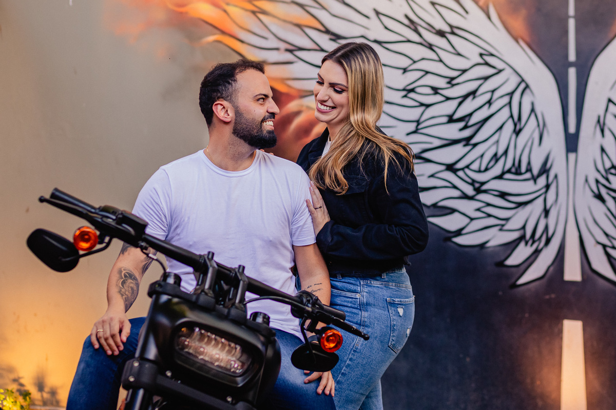 O pré-wedding da Mari estava marcado pra outubro, o local já estava definido por eles: seria na fazenda, lugar que ela ama estar. Mas, como ela sabia da paixão dele por moto, quis fazer uma surpresa pra ele, pra que ele se sentisse ainda mais feliz com esse momento. Ela entrou em contato com o pessoal do bar RZD Garage pra fazer um ensaio lá, acertou tudo com a gente e com o Douglas da Ajuda Filmes, e quando já estava tudo certo, contou pro Matheus que não só topou, como AMOU.