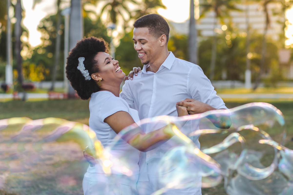 Pra deixar mais romântico, o fotógrafo que não é nem um pouco cara de pau pediu à um senhor que estava fazendo bolhas de sabão, pra dar uma passadinha por lá e aproveitarmos as bolhas pra foto!