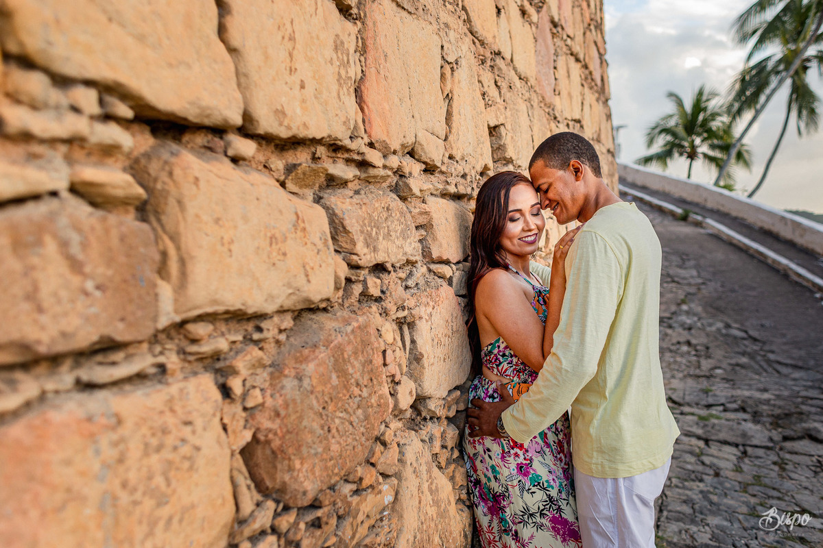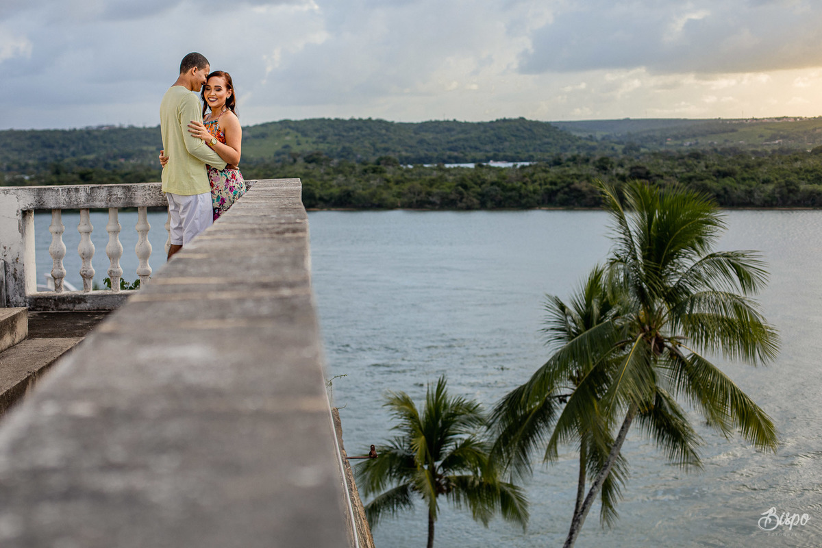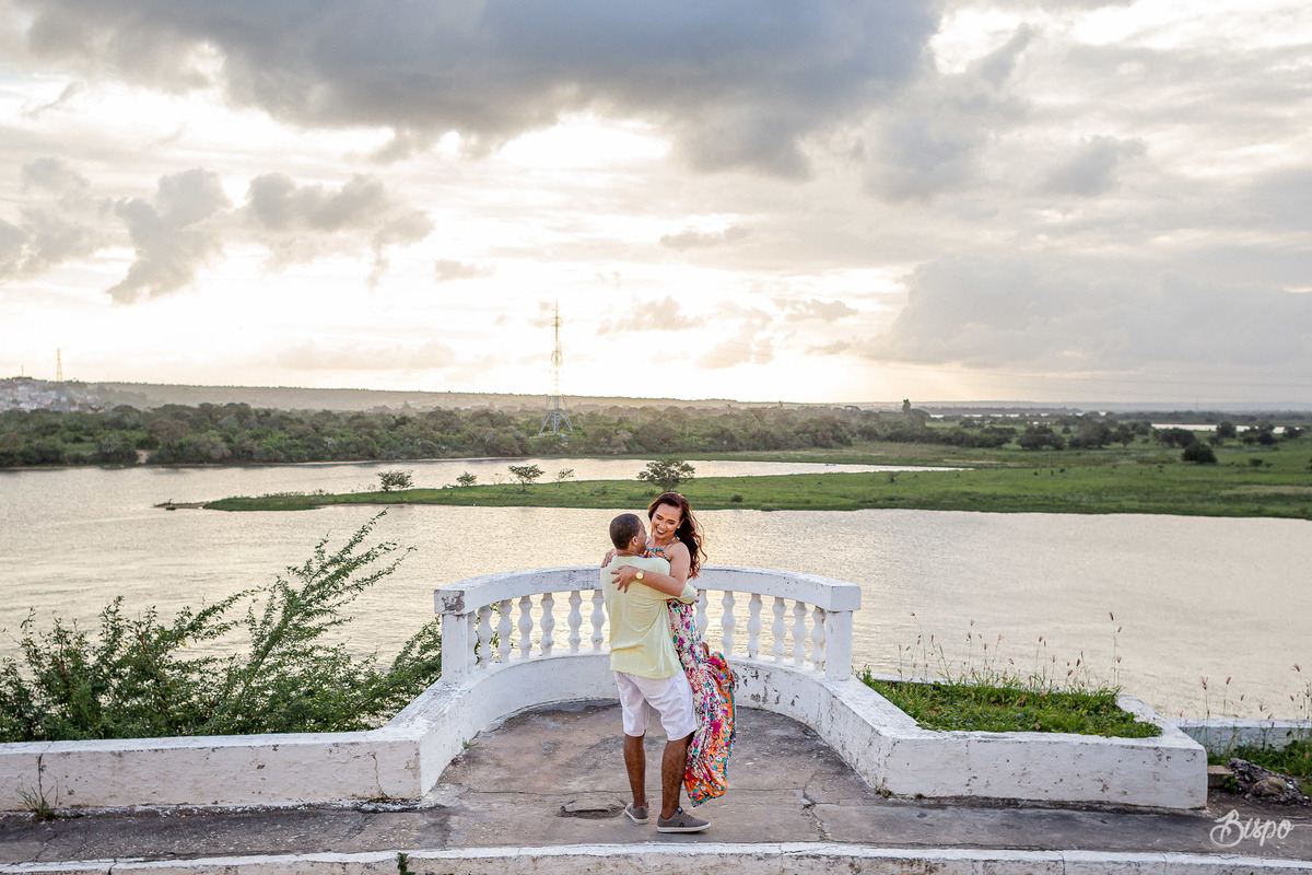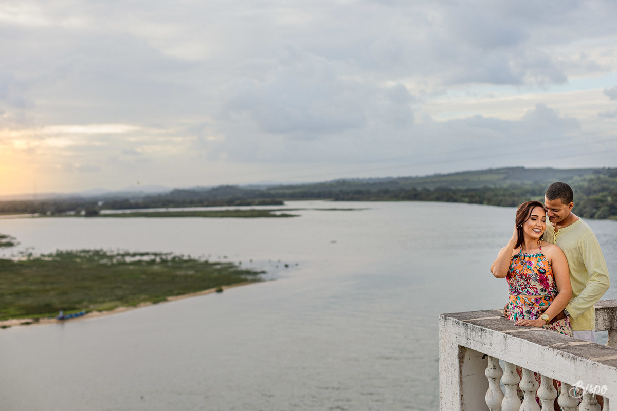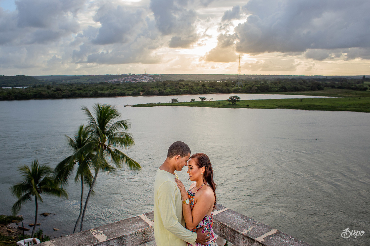 Durante uma conversa sobre o ensaio, perguntamos se eles tinham algum lugar em mente, algum lugar especial, que representasse algo... A Cláudia falou que gostaria de fazer em Penedo, pois lá viveu a infância e a pré-adolescência, e além disso é apaixonada pela beleza histórica da cidade, principalmente por um ponto turístico de lá: A Rocheira (antigo forte). Aproveitamos um feriado aqui de Aracaju, para ir até Penedo e registrar esse momento mágico e empolgante pro casal, que é o pré-wedding. O que não imaginávamos é que o dia amanheceria chuvoso tanto em Aracaju, como em Penedo. Ficamos um pouco preocupados, mas oramos e confiamos que a chuva ia passar e conseguiríamos fazer o ensaio tranquilamente. No meio do caminho fomos presenteados com um lindo sol e um belíssimo céu azul aparecendo entre as nuvens.