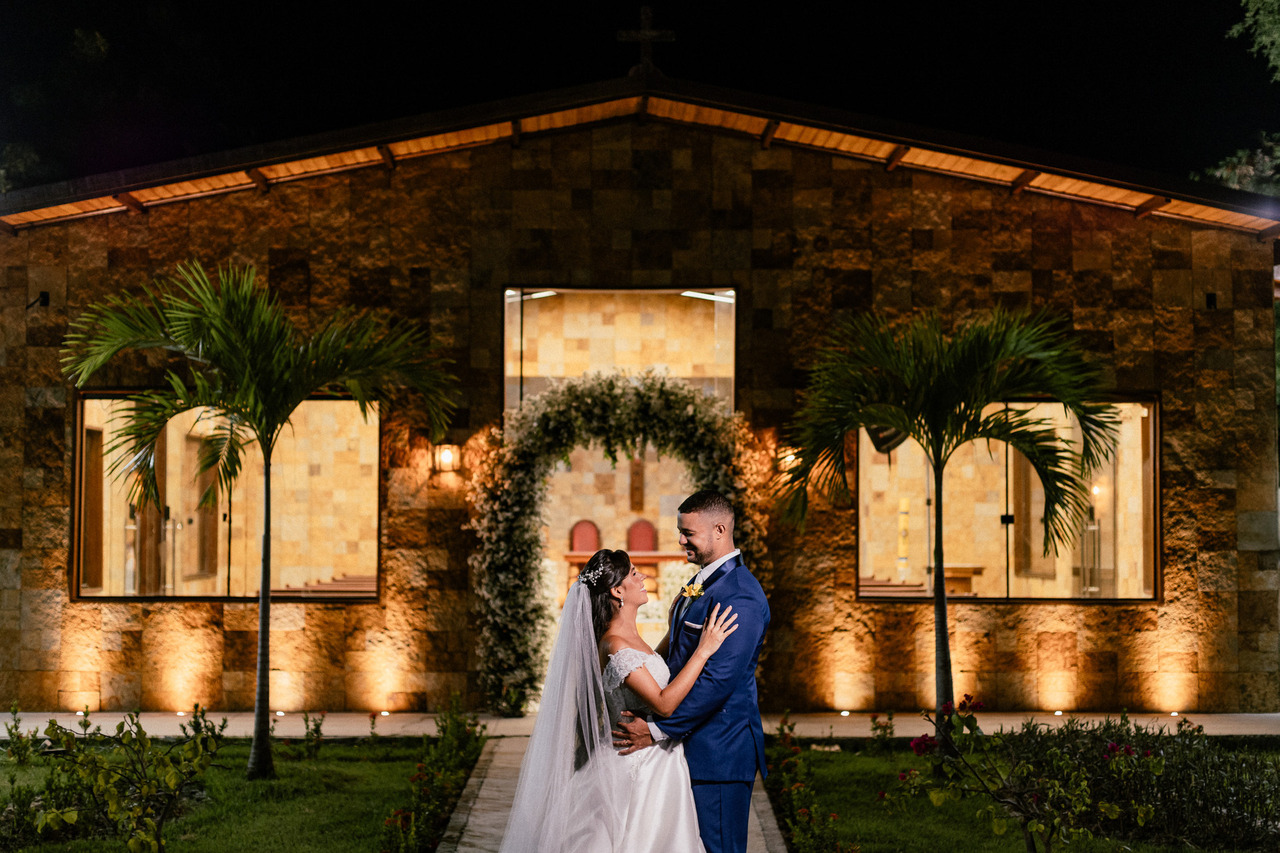 As janelas de vidro deixam a luz natural entrar com tudo — o que a gente, como fotógrafos, ama! rsrs. Logo na entrada, o caminho é cercado por um jardim com palmeiras e flores que completam o clima romântico do lugar. Por dentro, a capela surpreende: o ambiente é moderno e conta com iluminação em LED, trazendo um contraste lindo com o estilo rústico da parte externa.